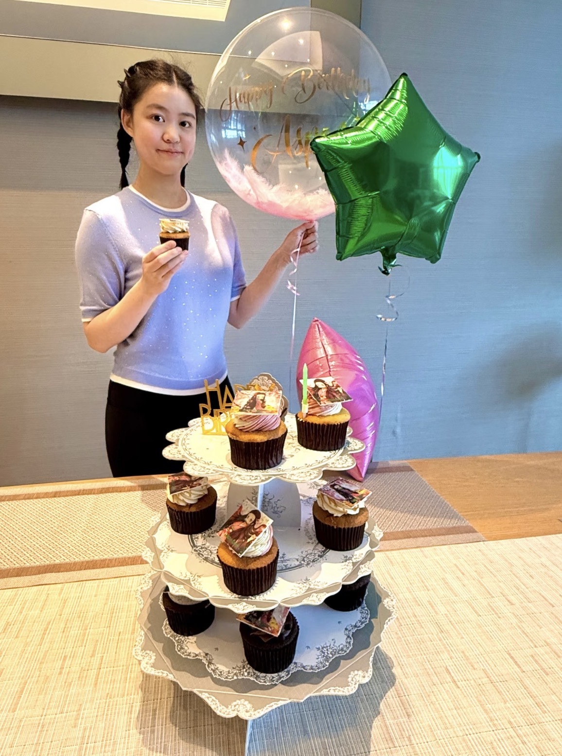 在海洋公园庆祝生日之余,少不了的还有庆祝生日的仪式感,没有很隆重的生日派对,看起来一切的布置就是简简单单。生日会现场只有三个气球,一个绿色、一个粉色的五星星气球,还有一个专属定制的透明气球,上面写了“生日快乐及刘秀盈的英文名”。实际上就连生日蛋糕也很简单,就是由数个杯子蛋糕组成,一共叠了三层,不过细节做得满满,每一个蛋糕上都有刘秀盈喜欢的动画人物的卡片。