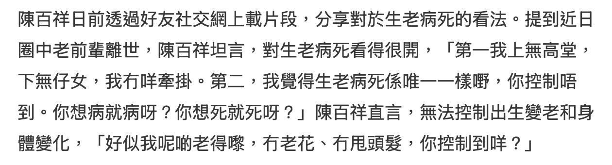 现年76岁的香港资深艺人陈百祥已经步入老年阶段,而在2022年宣布息影,又明显减产的他,如今专注的就是享受人生,当然也不可避免地要面对生老病死的问题。这没有什么可意外,明星、艺人也是人,也要经历人生终结的那个阶段。对此陈百祥也不避讳,他在社交平台上分享了对生老病死的看法,显得很通透,也很洒脱,更直言希望能平静无痛,体面地离开这个世界。