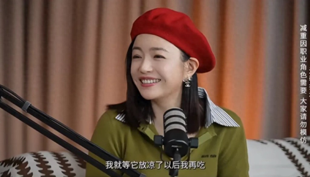 笑起来有两个梨涡,讲话的时候慢条细语的。她说女明星压力很大,自己为了减肥不敢吃热饭,都是放凉了再吃,因为自己吃热的东西会长胖。