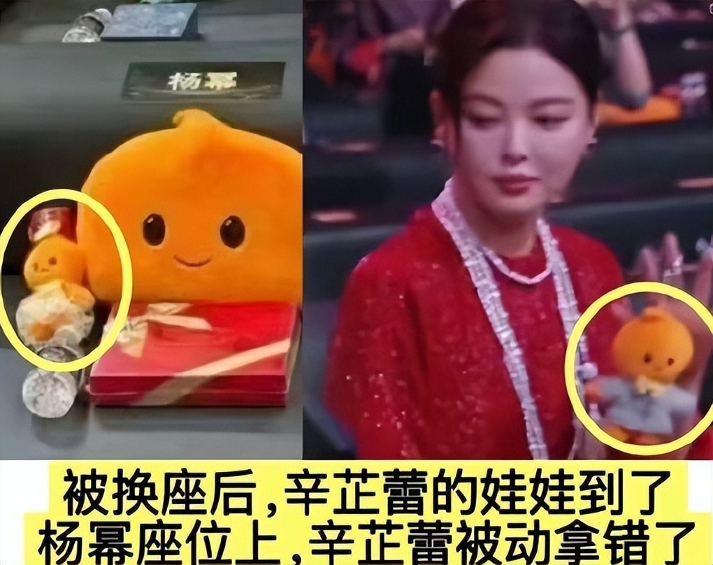 比如辛芷蕾的娃娃就是穿着白色礼服领奖的那套造型,可后面的镜头中,她拿的明显是杨幂的“绣绣”同款小人。