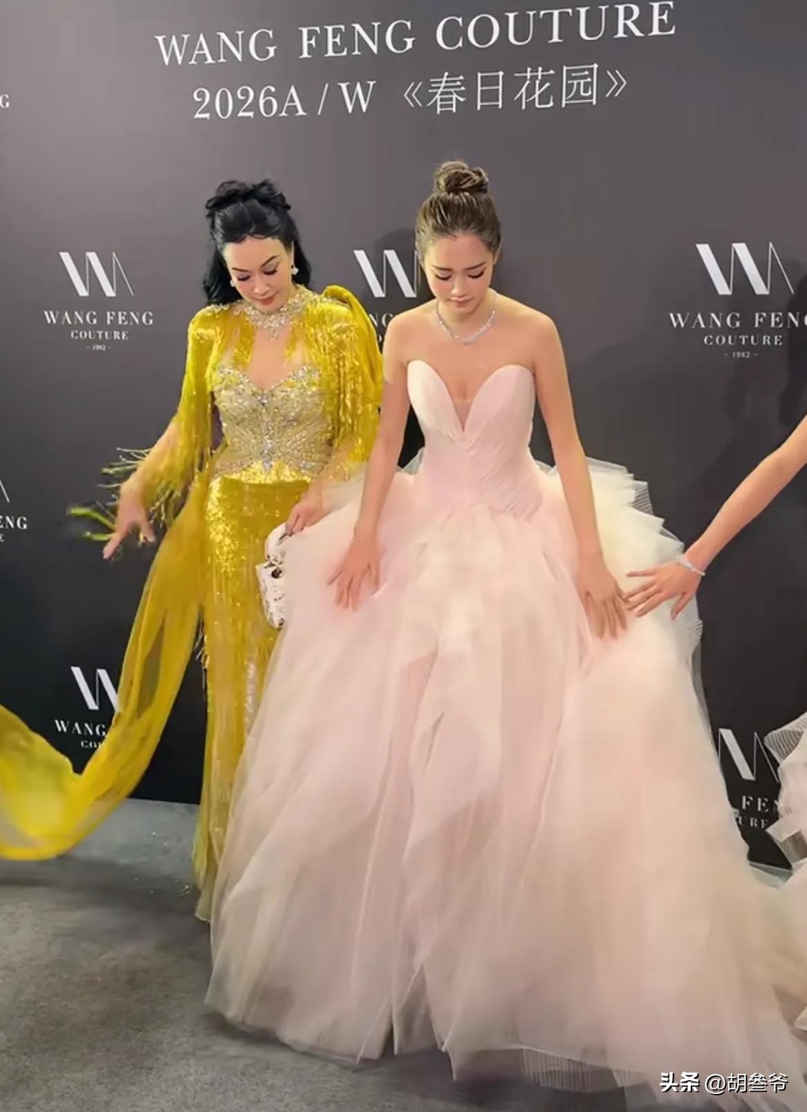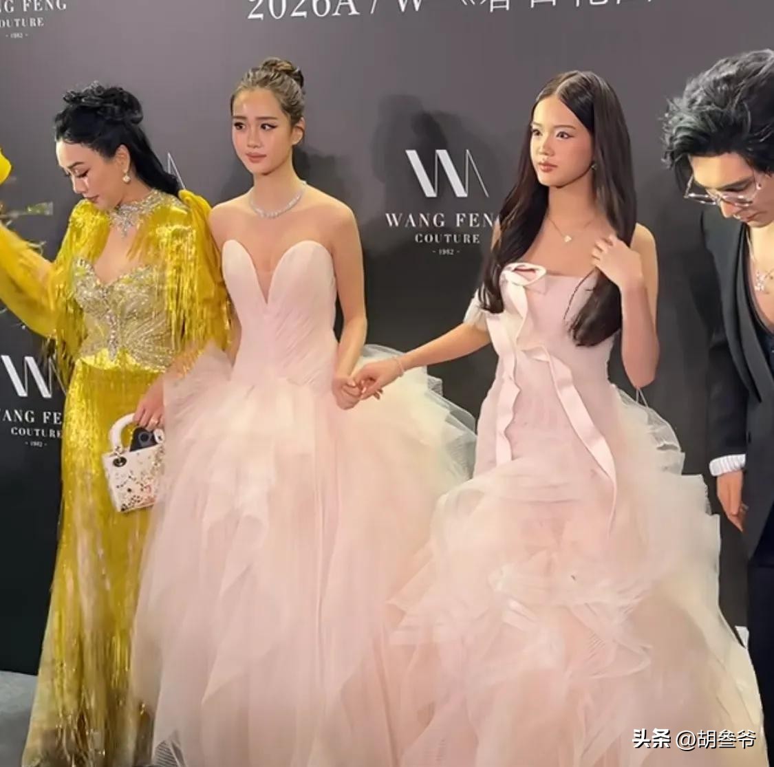 考拉和Jaden姐妹俩则走在中间,都穿了白色打底搭配粉色系礼服,考拉扎着清爽的丸子头,穿粉色抹胸拖尾长裙,少女感十足。