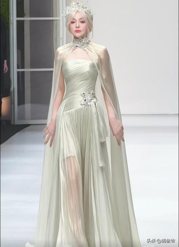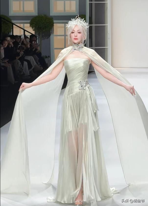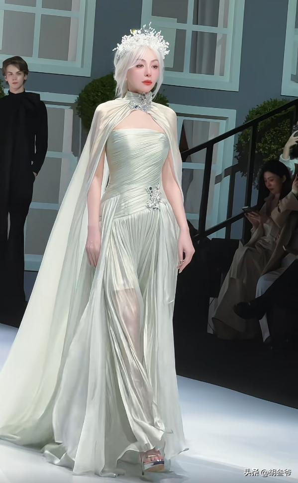 换上银白色抹胸纱裙搭配披肩,头上再戴上银冠,一头白发衬得她气场全开,披风一扬的瞬间,妥妥的冰雪女王本人。