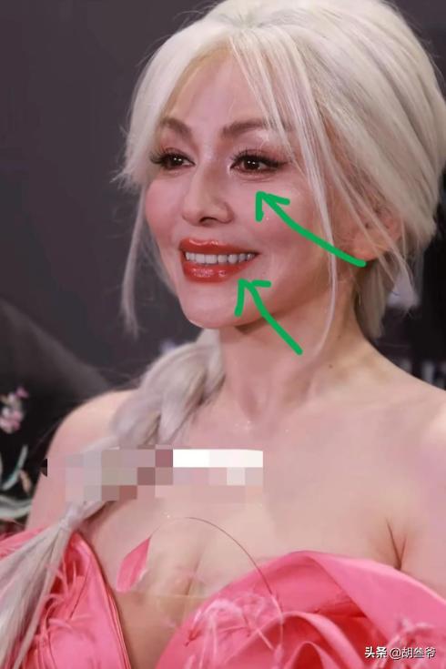 55岁的年纪,脸上的纹路本就藏不住,偏偏妆容又打得过于厚重,底妆白到假面,鼻翼和法令纹处还明显卡粉,让整个妆面显得格外脏,一点都不清透。
