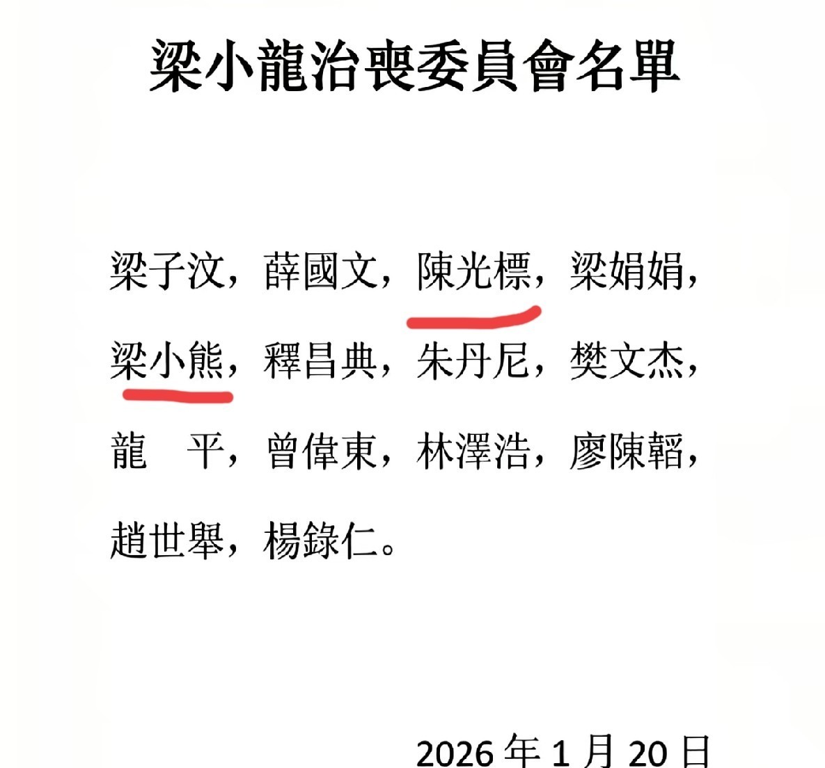 很多圈里人都发悼念,成龙周星驰都提了。结果到20号头七这天,梁小龙徒弟说大家在守夜,并公布了一张14人的治丧名单。名单里居然没有他的子女,倒是出现两个让人意外的名字:一个是慈善家陈光标,另一个是弟弟梁小熊。