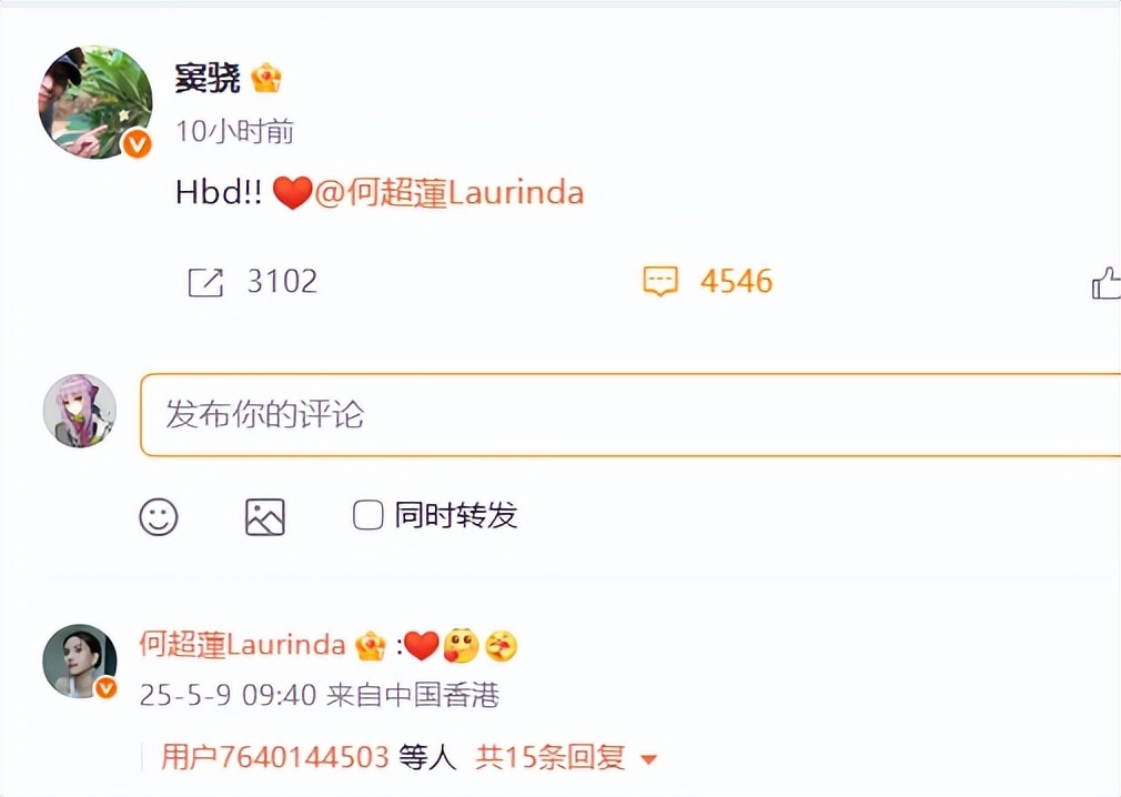 何超莲过生日,窦骁也没有发合影甜蜜互动,只是简单的发了生日快乐的缩写字母祝贺。