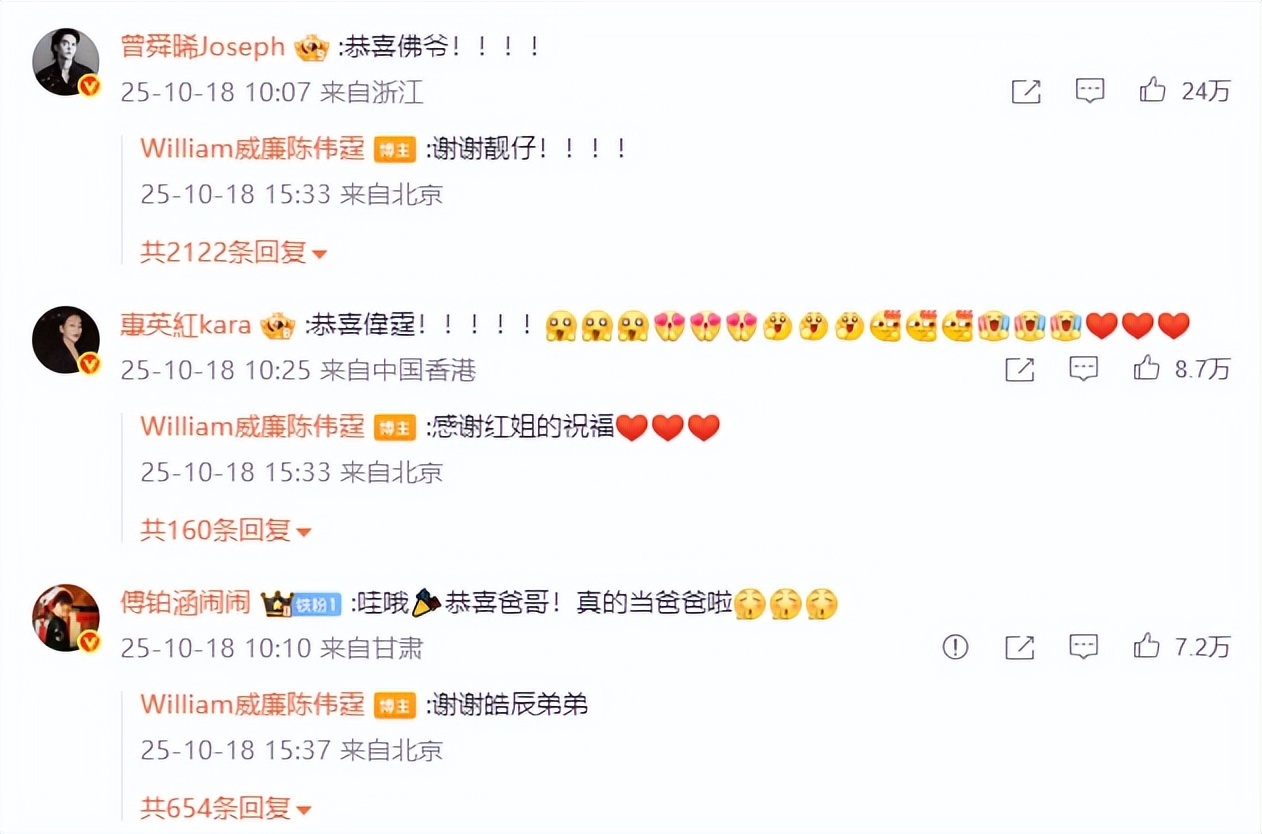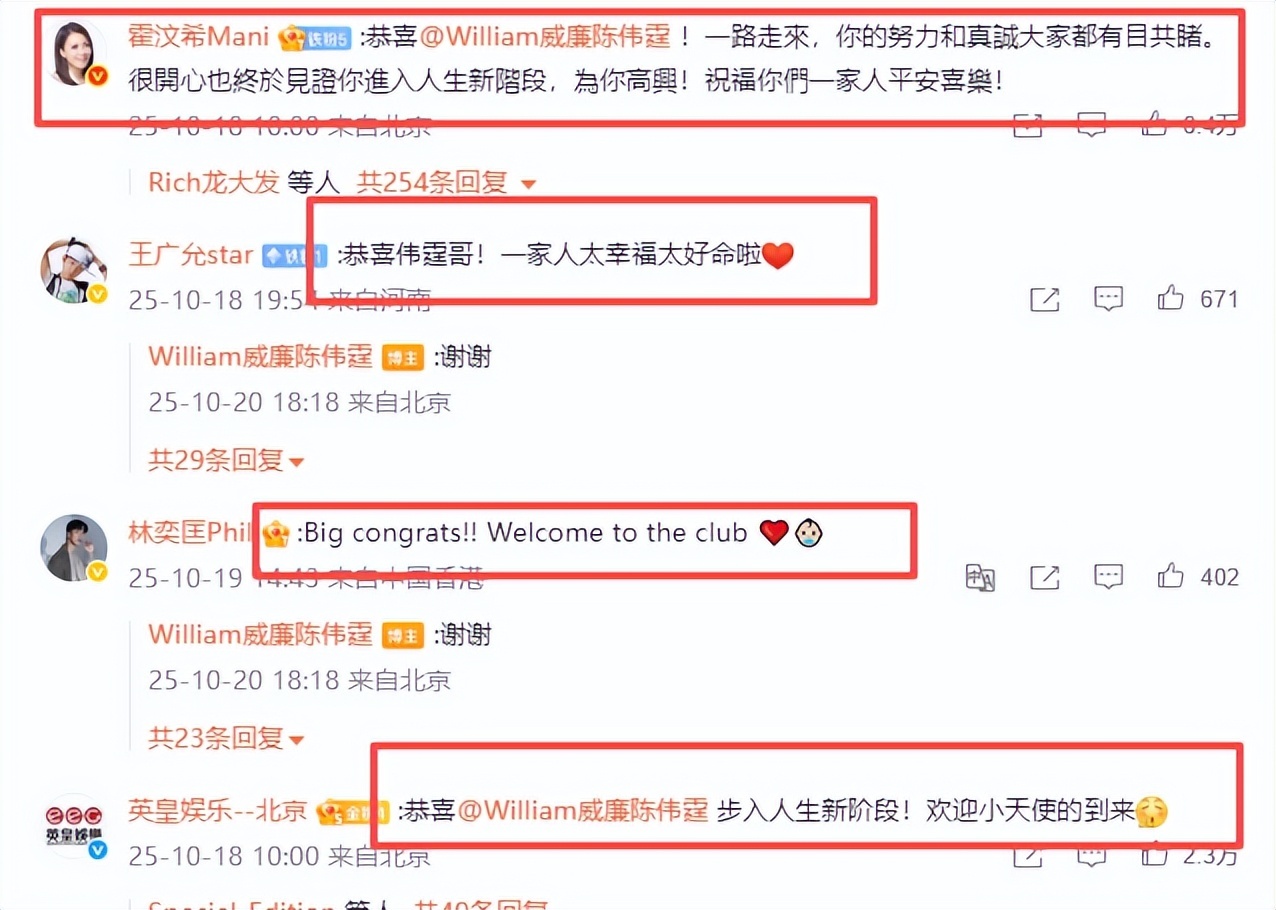 #陈伟霆何穗生子#的话题阅读量瞬间破亿,评论区清一色的“惊呆了!”和“恭喜!”。