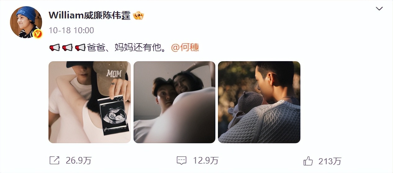 10月18日,陈伟霆与何穗一句“爸爸、妈妈还有他”直接让微博“爆”服,跳过所有流程,官宣生子。