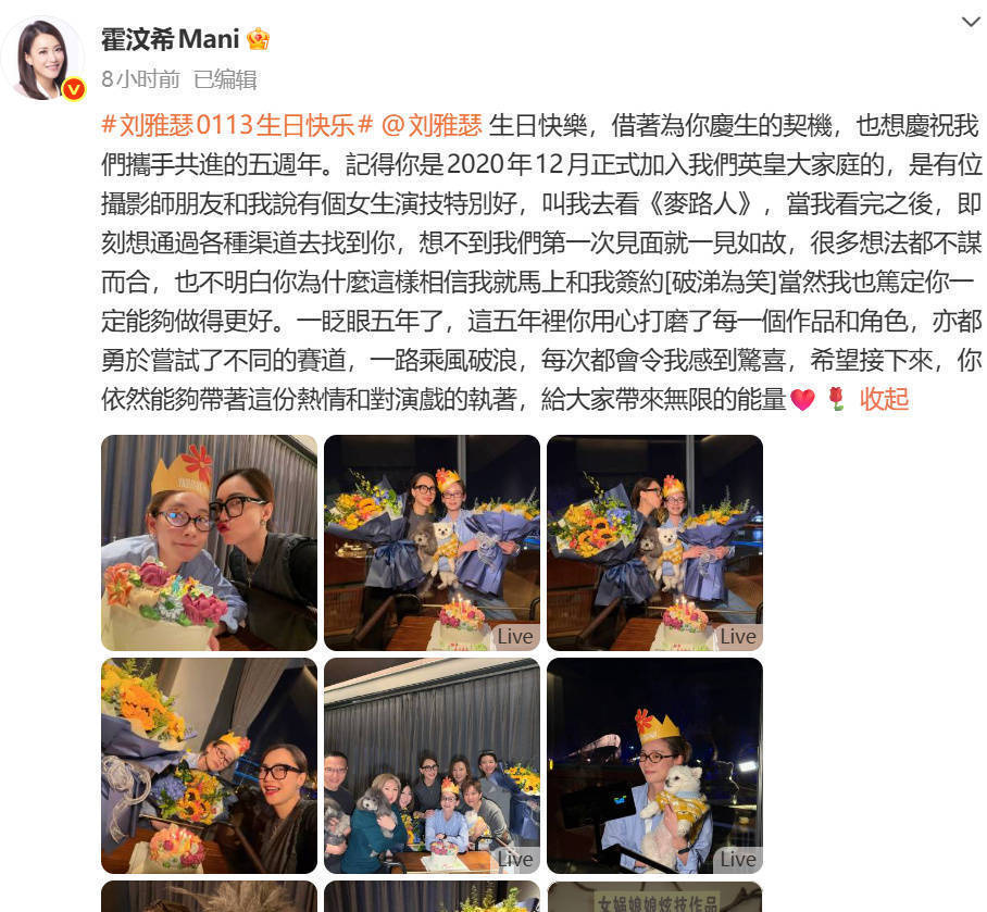 1月13日,霍汶希在社交平台发布图文,为刘雅瑟送上生日祝福,同时纪念二人携手合作的五周年,全文写道:“生日快乐,借着为你庆生的契机,也想庆祝我们携手共进的五周年。记得你是2020年12月正式加入我们英皇大家庭的,是有位摄影师朋友和我说有个女生演技特别好,叫我去看《麦路人》,当我看完之后,即刻想通过各种渠道去找到你,想不到我们第一次见面就一见如故,很多想法都不谋而合,也不明白你为什么这样相信我就马上和我签约,当然我也笃定你一定能够做得更好。一眨眼五年了,这五年里你用心打磨了每一个作品和角色,亦都勇于尝试了不同的赛道,一路乘风破浪,每次都会令我感到惊喜,希望接下来,你依然能够带著这份热情和对演戏的执著,给大家带来无限的能量。”