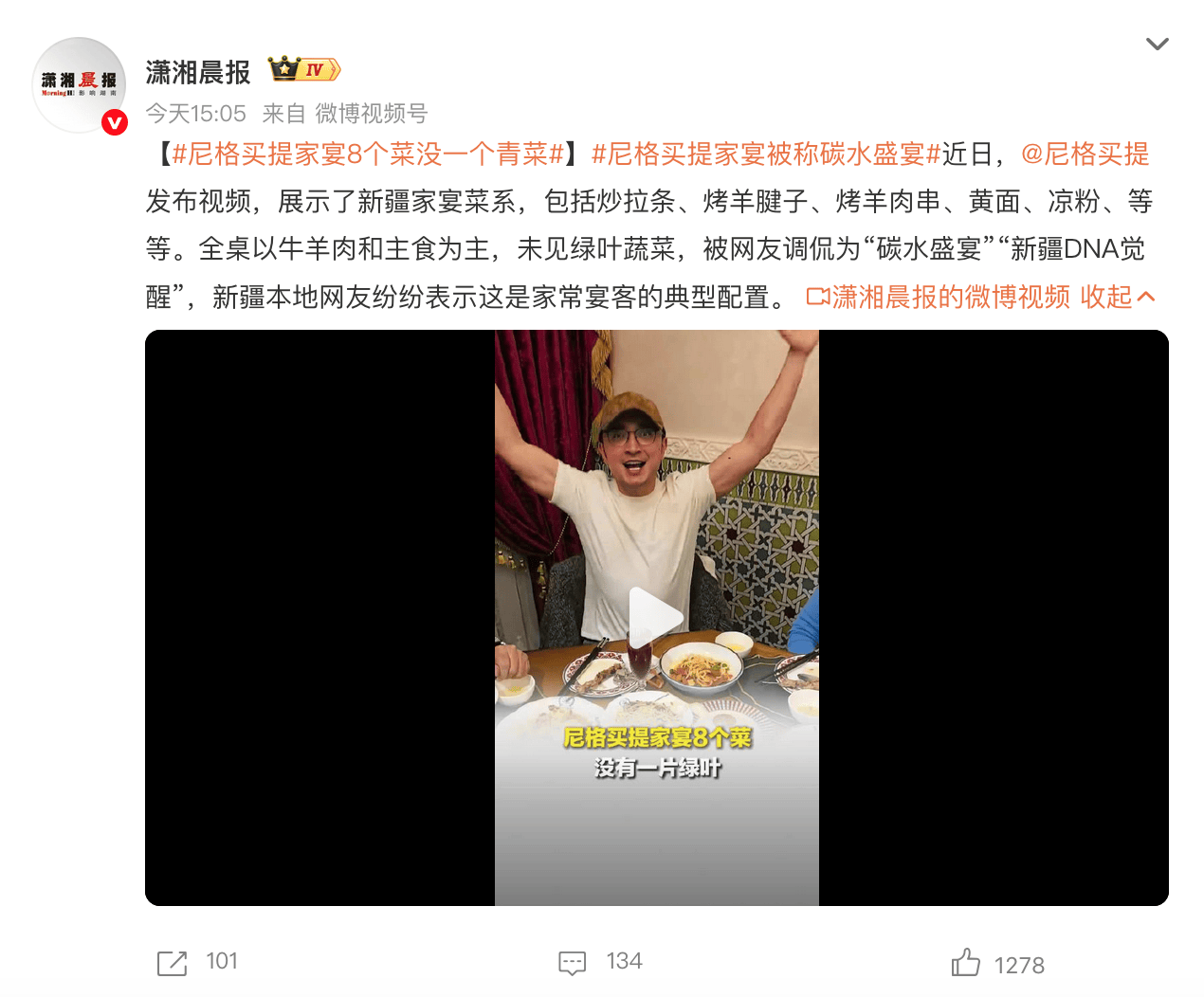 近日,尼格买提在社交平台晒出一桌丰盛的新疆家宴,炒拉条、烤羊腱子、羊肉串、黄面、凉粉……全是肉和主食,唯独不见绿叶蔬菜,被网友调侃为“碳水盛宴”,还有人笑称“新疆DNA觉醒了”。对此,不少新疆本地网友表示,这样一桌肉+面的搭配,在当地招待客人确实很常见。