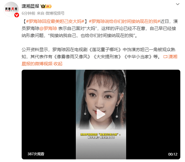 近日,演员罗海琼谈及外界对她“变大妈”的评价时表示,自己早已不再在意,坦然接纳当下的形象:“我接纳我自己,也给你们时间接纳现在的我。”