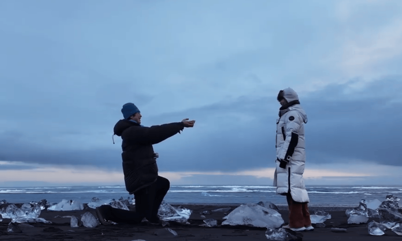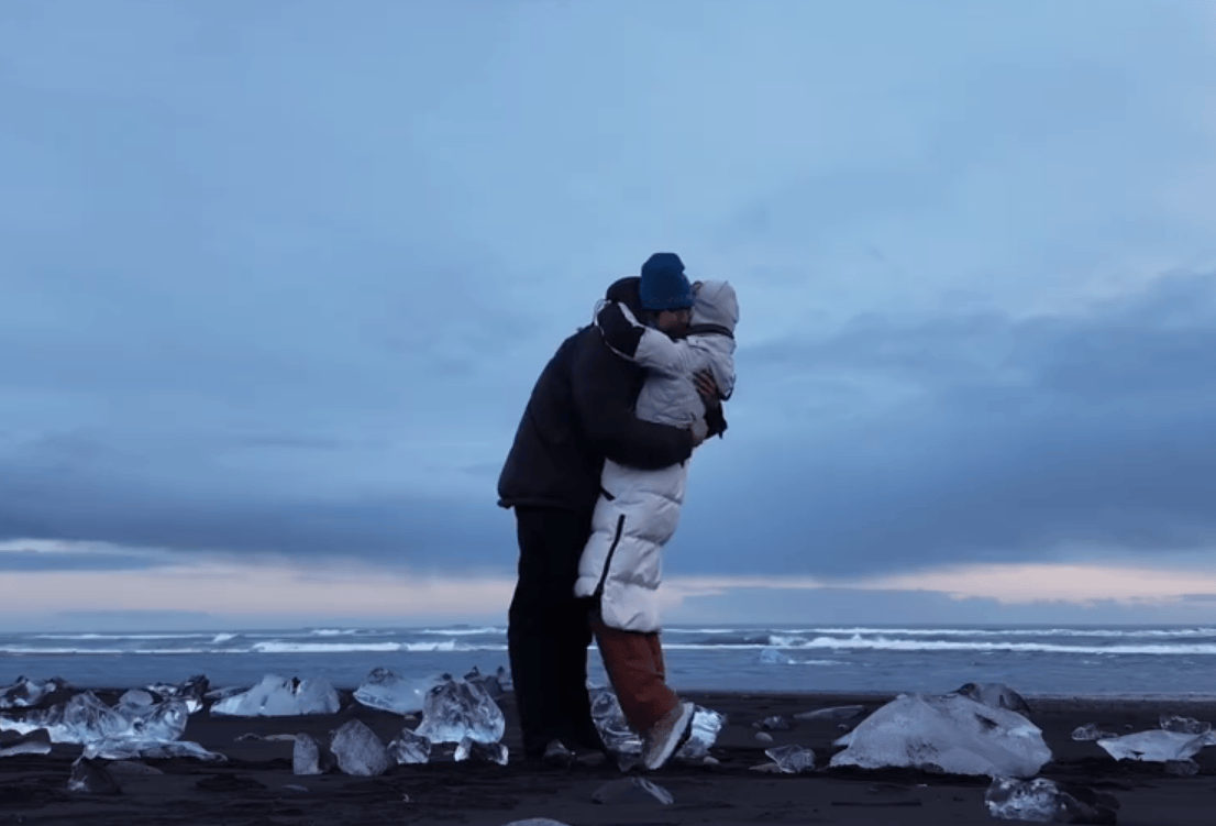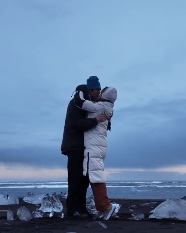 视频画面里,孙丞潇在冰岛向金莎浪漫求婚,两人欣喜相拥,甜蜜热吻,整个场景唯美又动人。