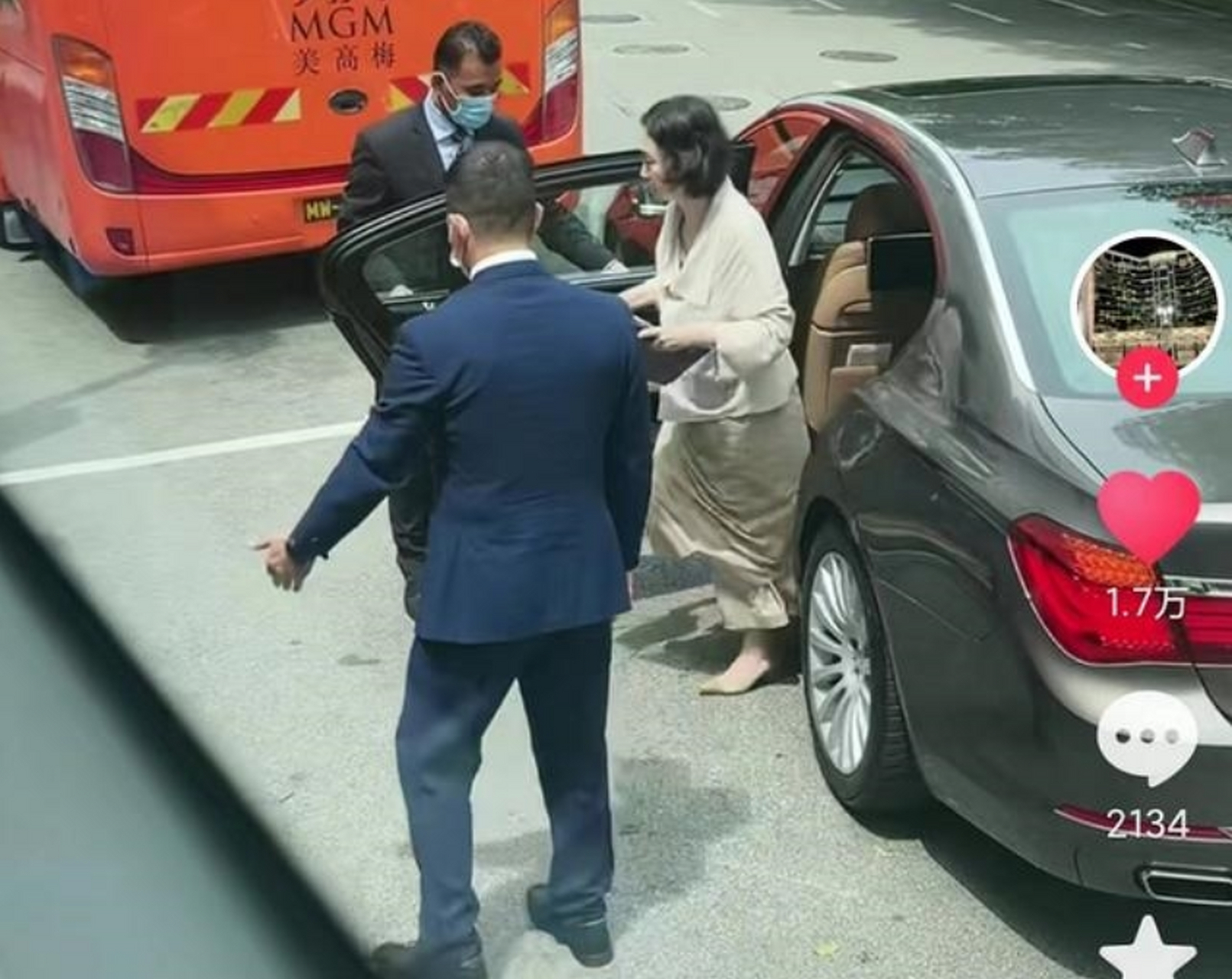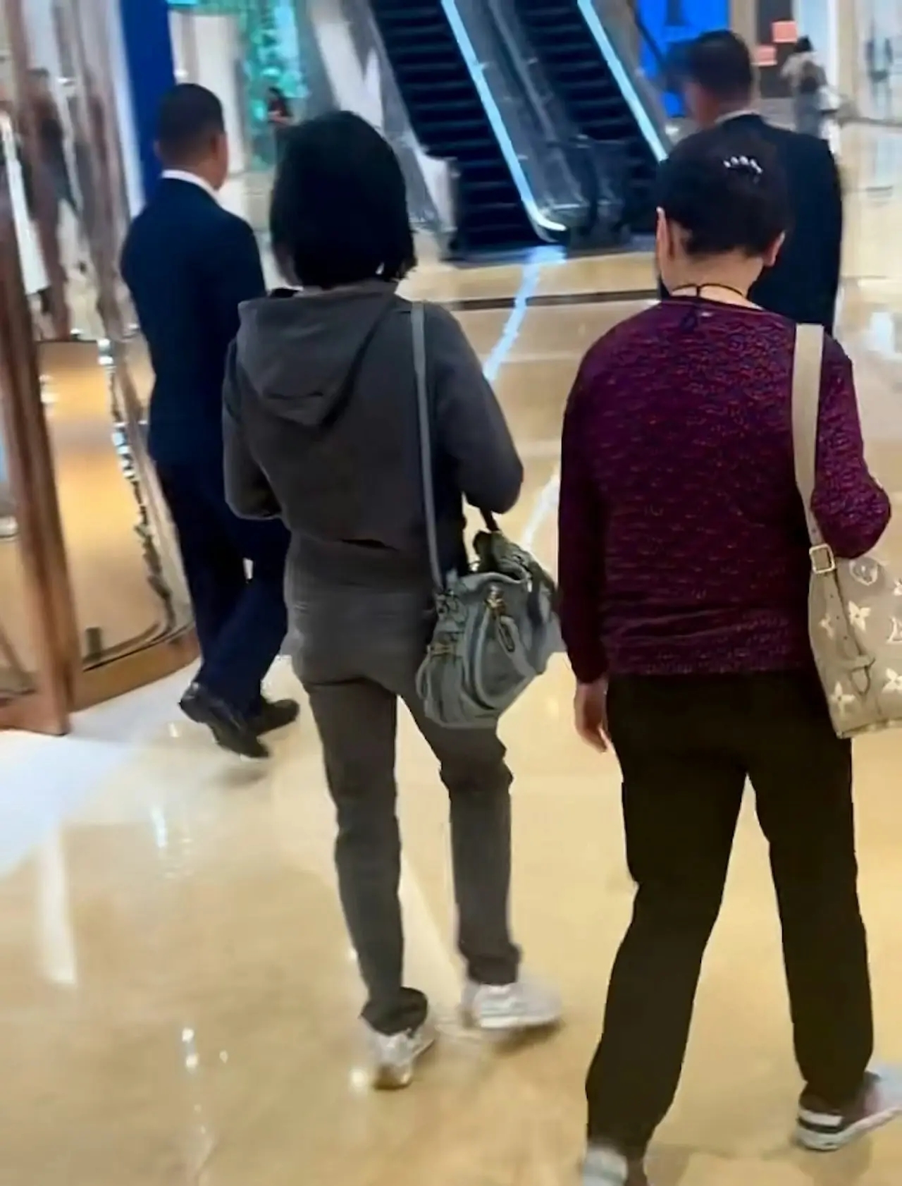 更魔幻的是,低调归低调,她身边的人一点不低调——前面两位西装保镖开路,旁边一位女助理拎着购物袋,身后还有保姆跟着。