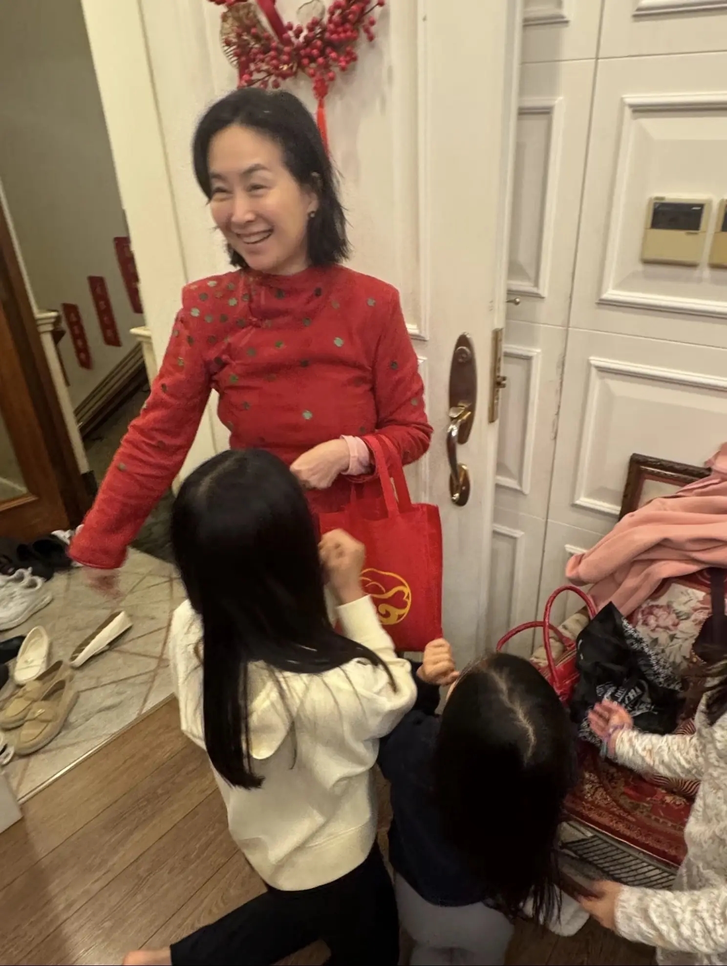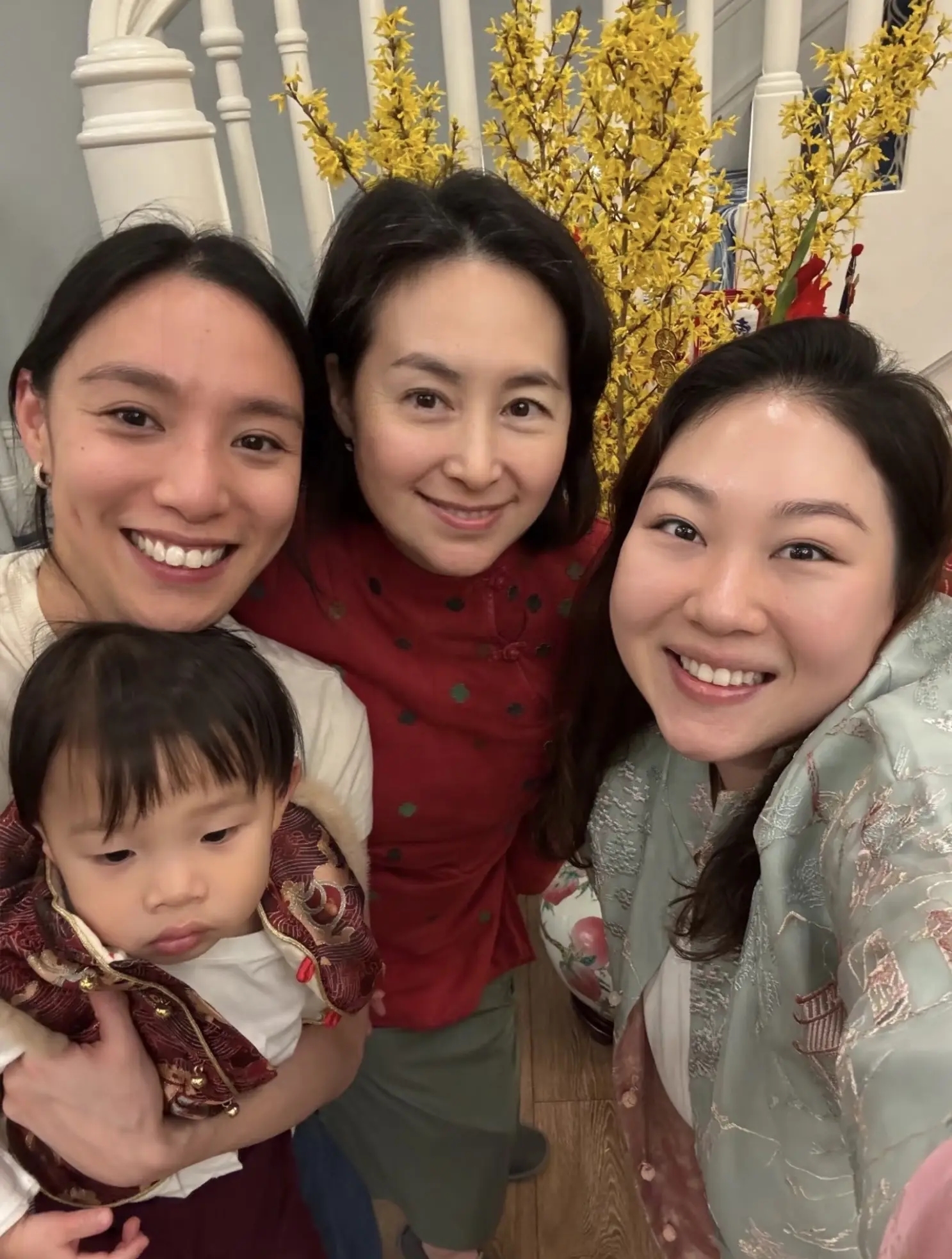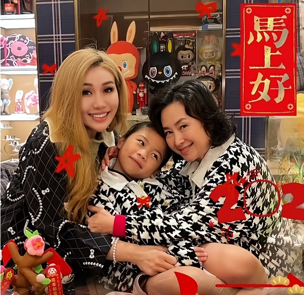 真正让网友热议的,反倒不是商场偶遇,而是前几天春节那组照片。何超琼去了四太梁安琪那边做客,跟何超盈一家同框。更抓人的是细节:她穿千鸟格外套,抱着何超盈的女儿,画面里像“亲子装”,两个人贴得很近,孩子在她怀里一点不认生。