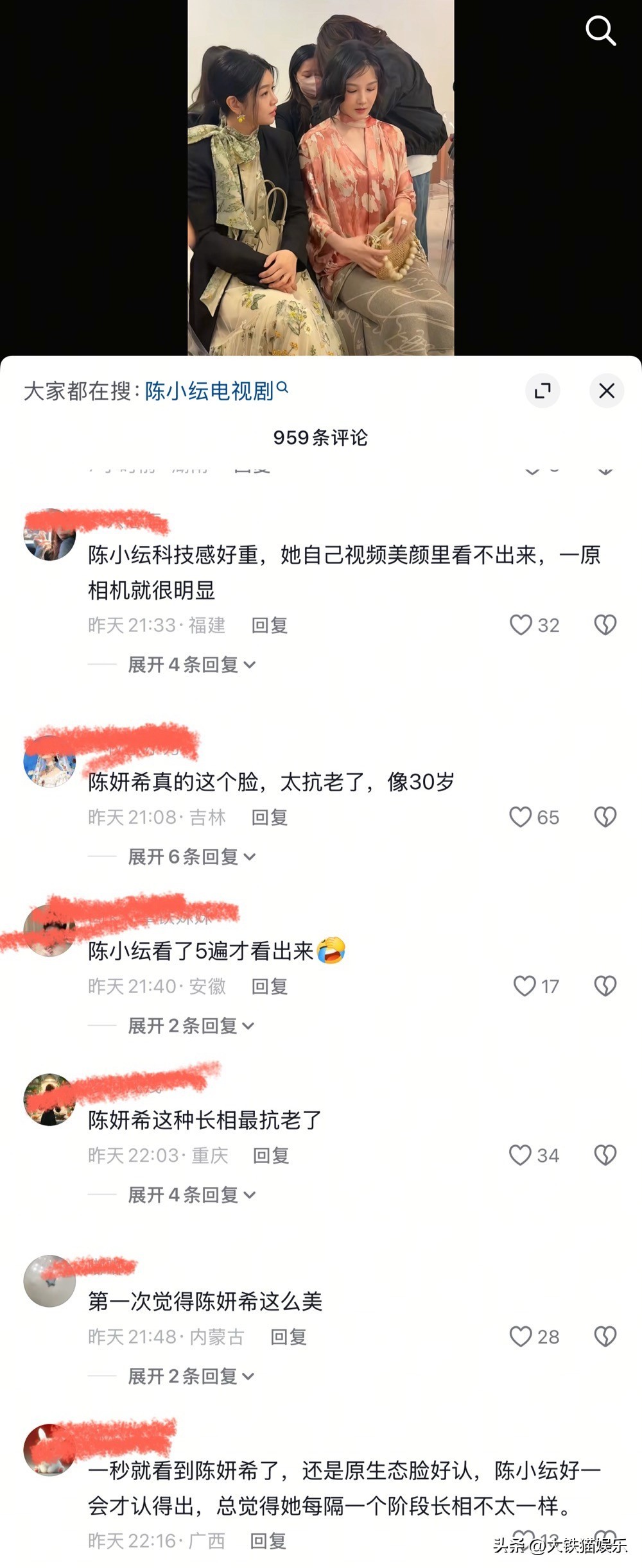 两人的同框视频在网上一传出,网友纷纷留言,有人说没认出来陈小纭,有人说陈妍希太抗老,看着像30岁。