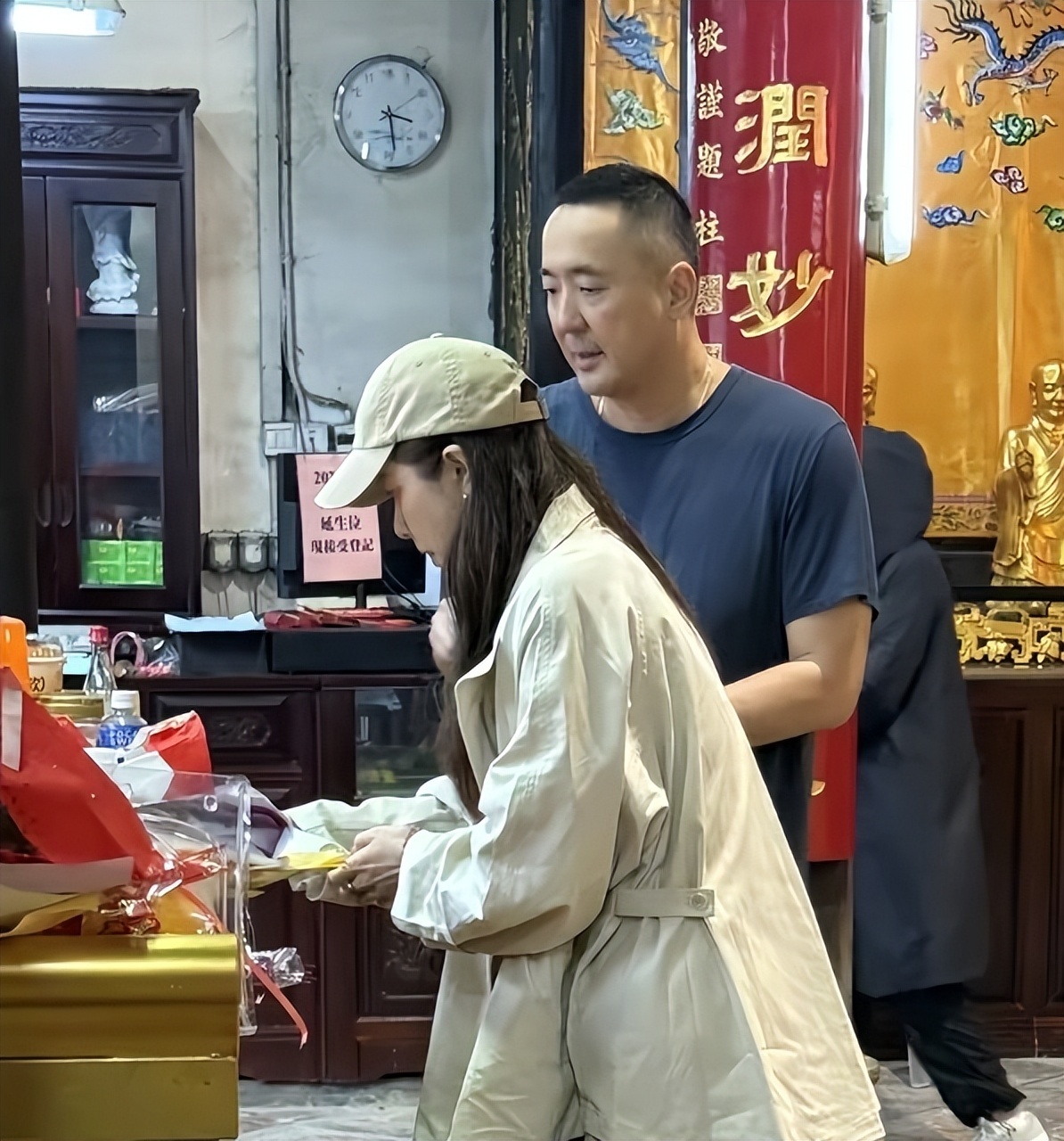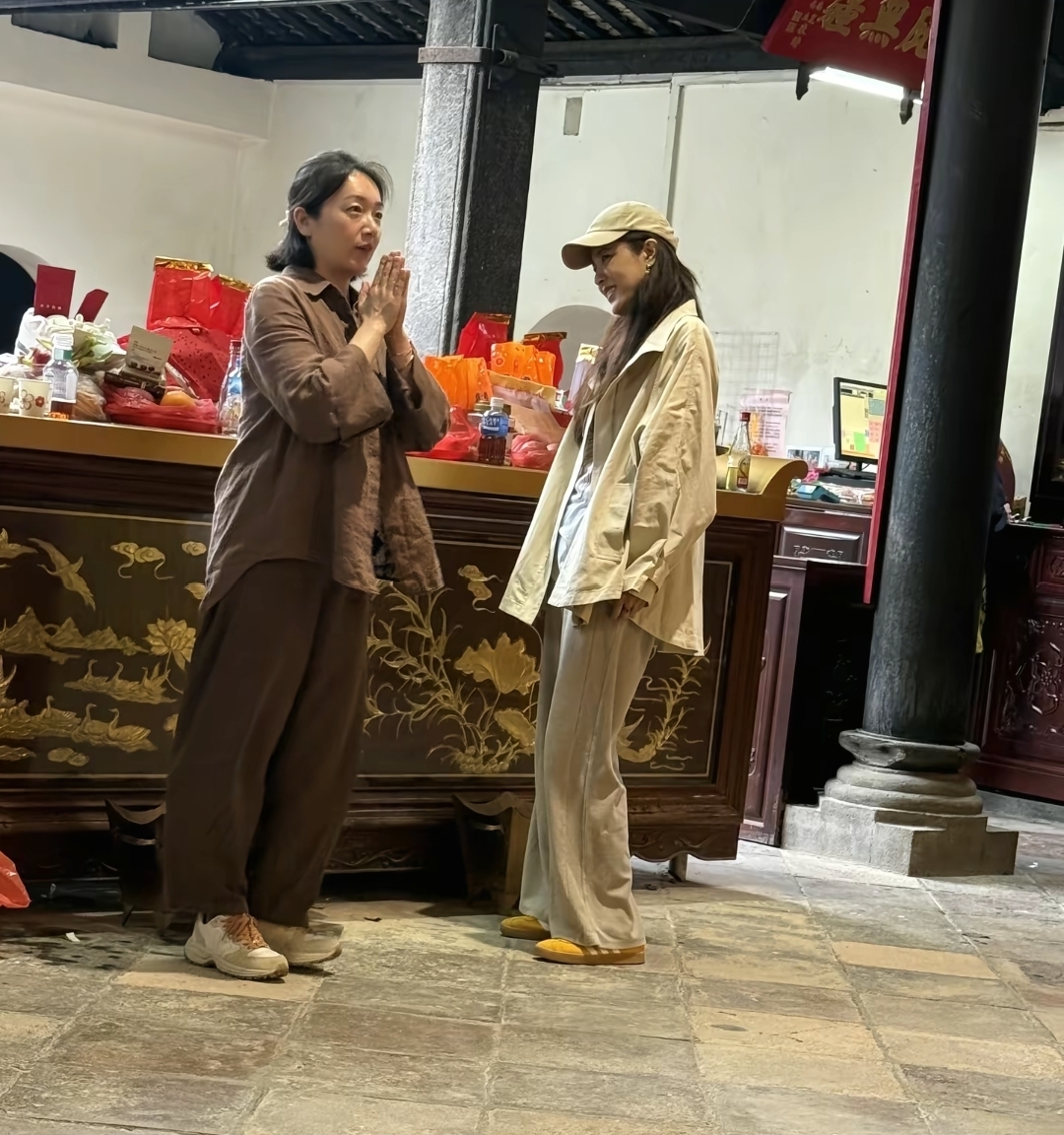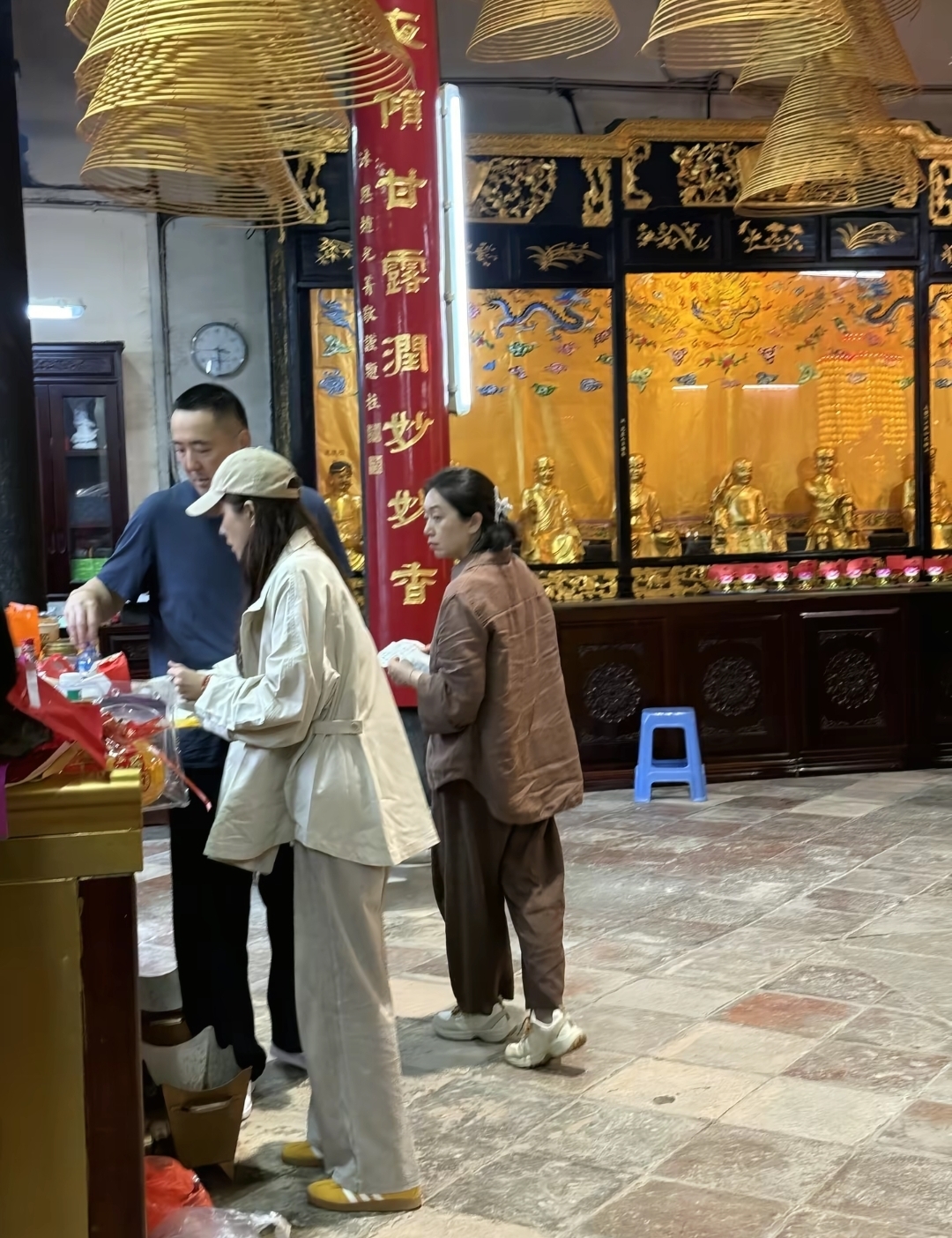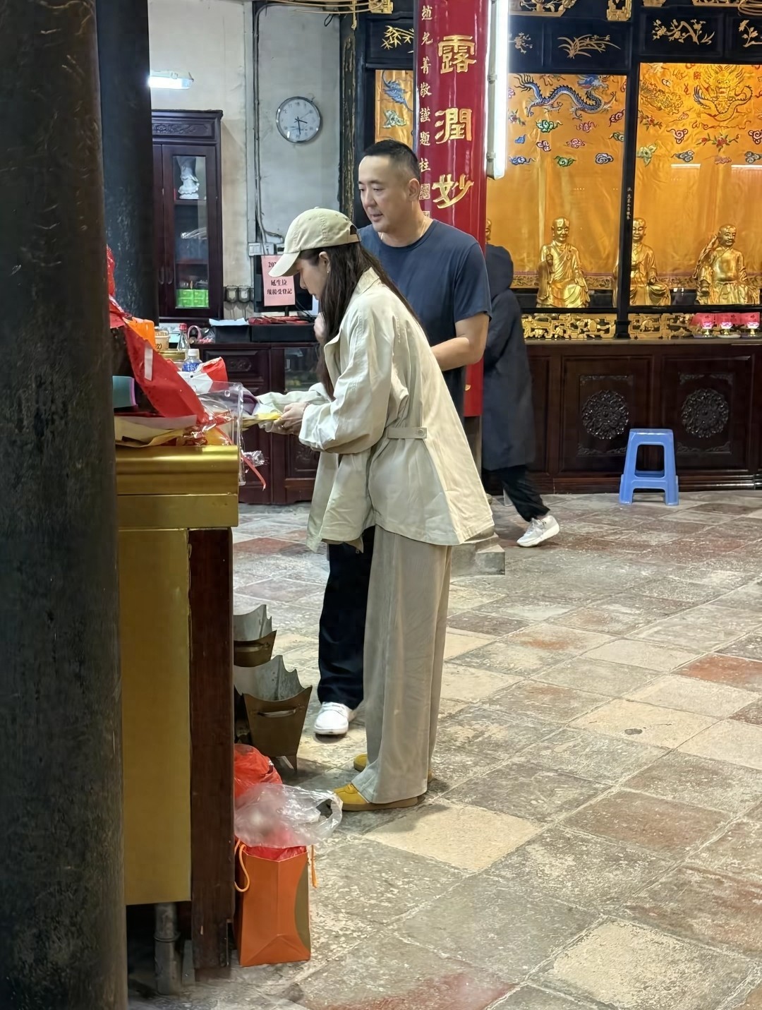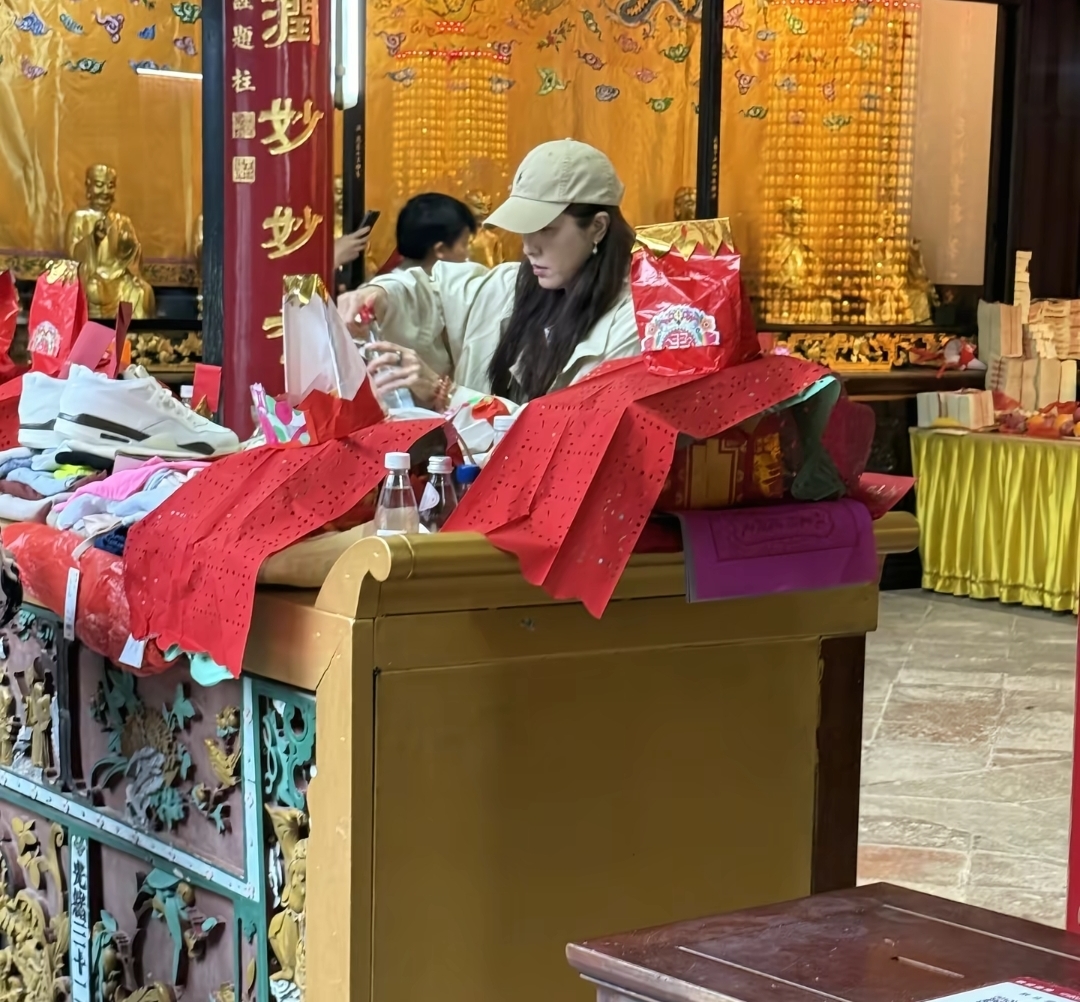 曾黎那天不急不躁,手里拿着祈福用的东西,时不时低头把袋子口捋顺。她不是那种“摆拍式的虔诚”,更像我们过年陪家里老人去庙里——怕漏了什么,怕拿错顺序,怕一阵风把纸吹走。