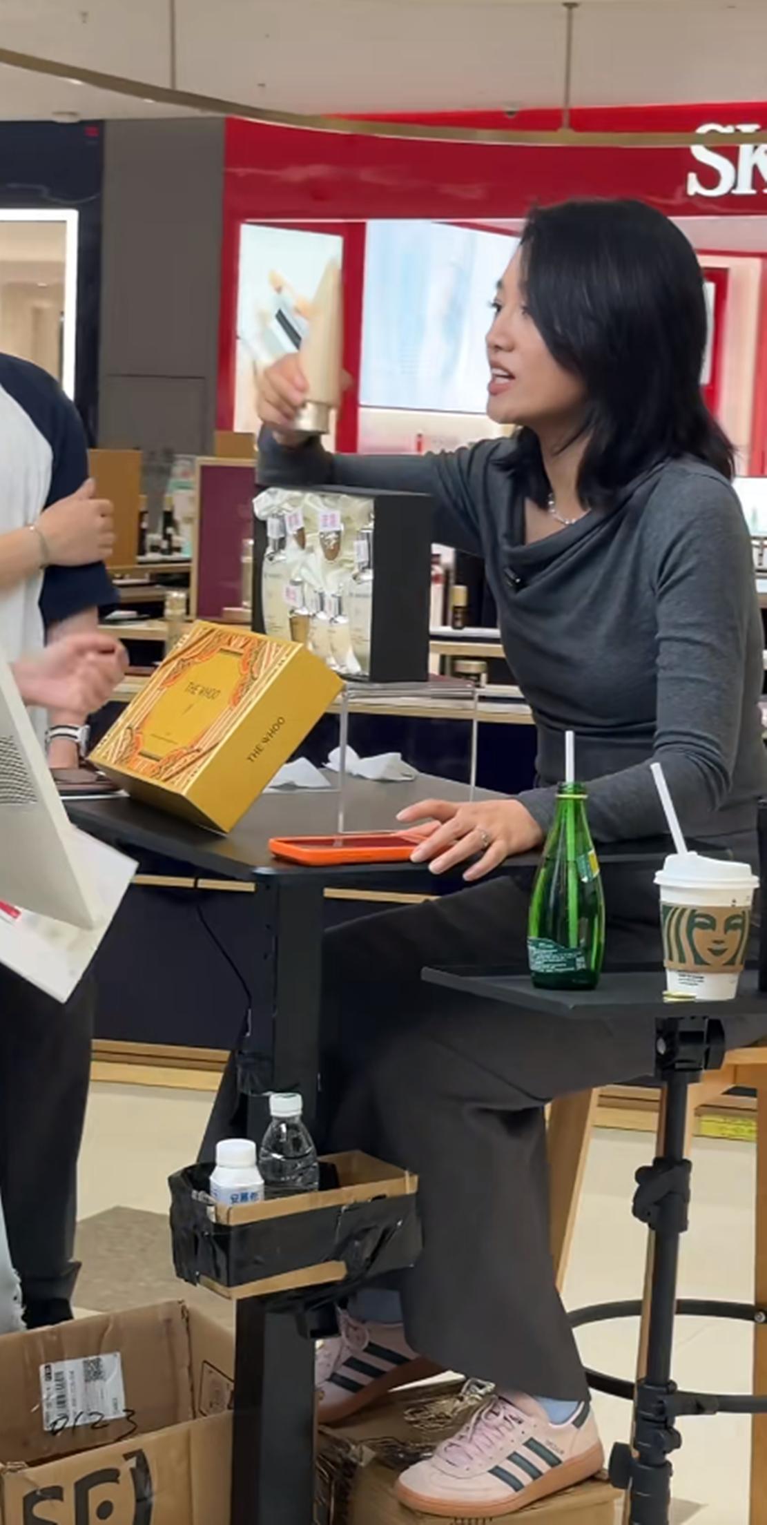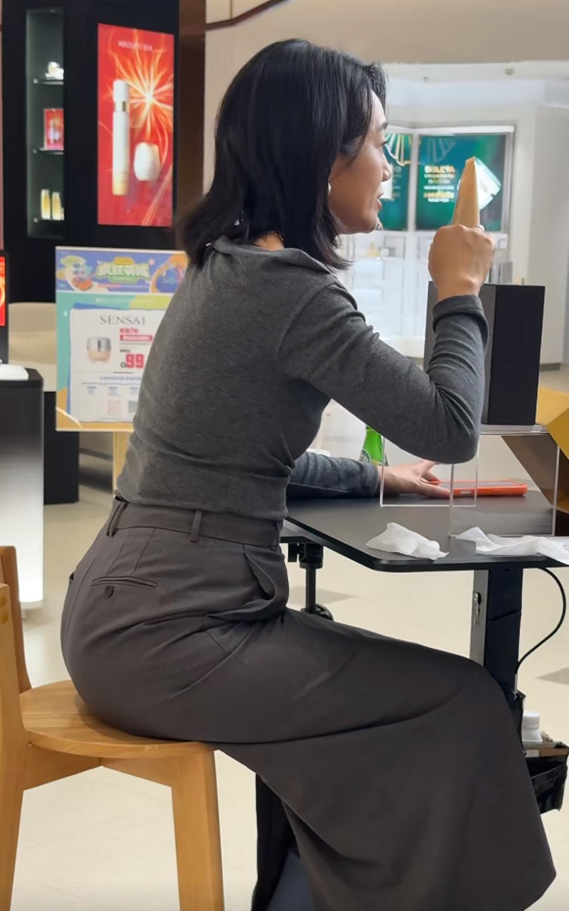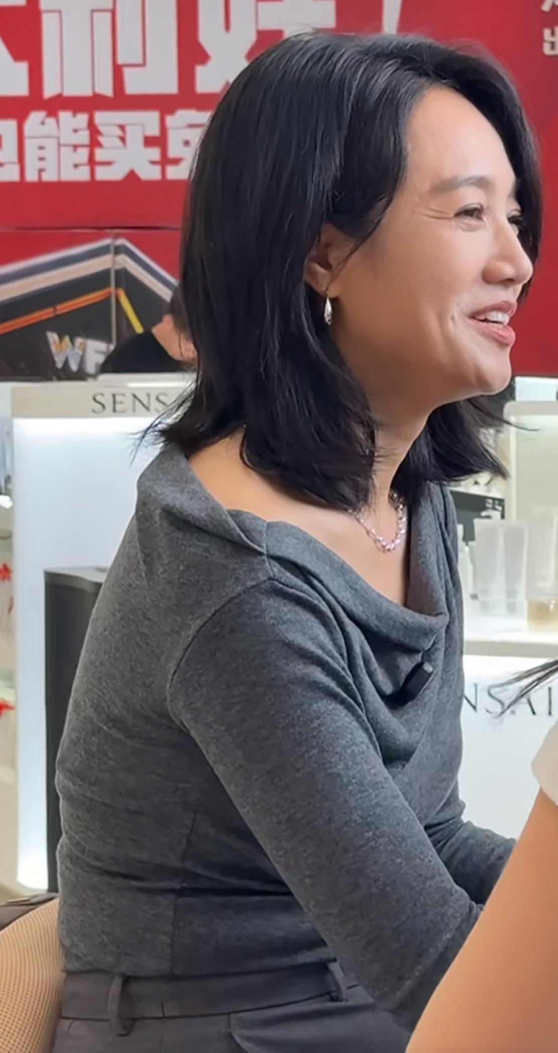 晒出的视频中,在某护肤品专柜前直播的朱丹,她身着一件灰色打底衫,领口设计略带宽松褶皱,既显随性又不失优雅。她留着一头乌黑柔顺的中长发,发尾微卷,自然披肩,侧脸轮廓柔和,面带微笑,眼神专注地望向镜头,流露出亲切与投入的神情。