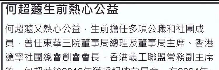 何超蕸生前与各房弟妹关系都不错。去年,三房弟弟何猷启就任东华三院主席,一向低调的她也专程前去捧场,并在晚宴上与三房、四房的弟妹们大方合影。
