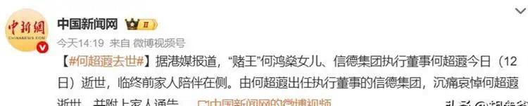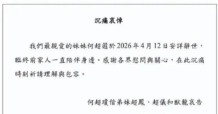 4月12日下午,信德集团官网变成黑白色。一份由何超琼、何超凤、何超仪、何猷龙四位姐弟联合署名的讣告发布:“我们最亲爱的妹妹何超蕸于2026年4月12日安详辞世,临终前家人一直陪伴身边。”