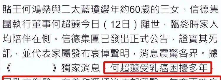 港媒披露,何超蕸长期受乳腺癌困扰,这次是因癌症复发,在养和医院的深切治疗部医治无效。这家医院也是她父亲赌王何鸿燊在2020年离世的地方。何家动用了顶级的医疗资源,但最终没能留住她。