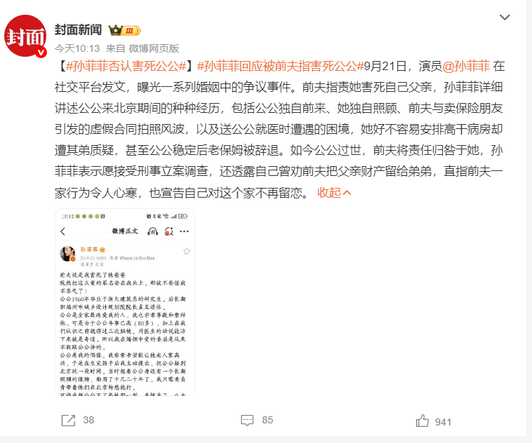 9月21日,演员孙菲菲通过社交平台发布长文,回应近期围绕其婚姻的诸多争议。针对前夫“害死公公”的指控,她详细回顾了事件全过程:公公独自来京期间,主要由她一人照料;其间发生前夫与保险销售朋友要求老人配合摆拍虚假合同的事件;后在送医救治过程中,她尽力协调安排高干病房,却反遭丈夫弟弟质疑。更令她心寒的是,老人病情稳定后,长期照顾他的老保姆被辞退。