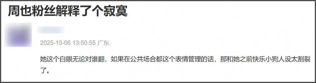 还有粉丝还试图澄清周也是对身边工作人员翻白眼不是对热巴,但拿出的证据却没有太大说服力。而且周也不止一次翻白眼,后续表情也不耐烦,网友表示不管是对身边工作人员或是其他人,在媒体和镜头众多的场合,周也的表情管理,和她以往营造出的形象更是半点不沾边。