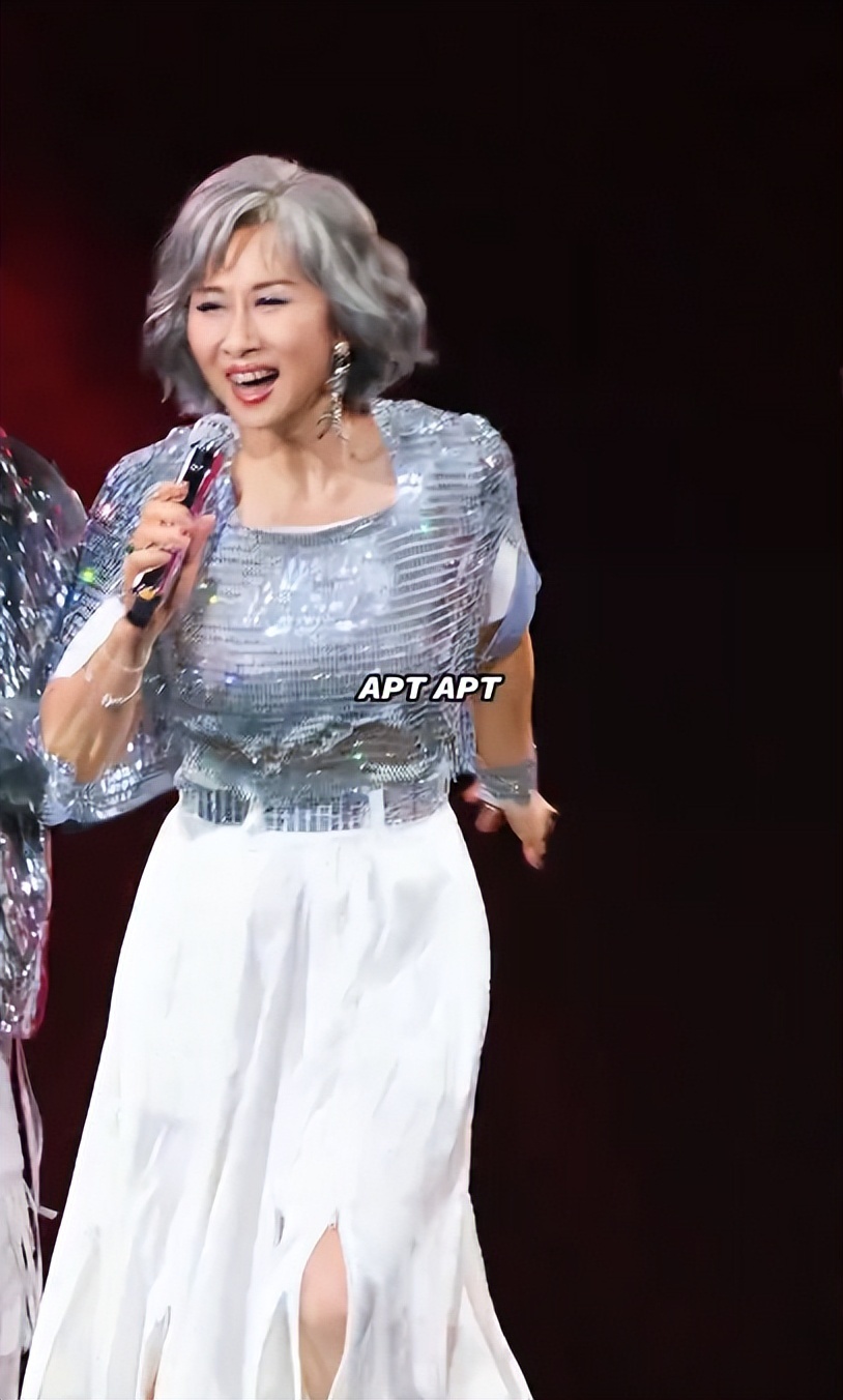 还有一套银色亮片上衣和白色开叉裙子,也是简约又时尚。跳舞的时候,裙摆随着舞步晃动,紧致的腰线、利落的肩颈线毫无老人感,网友忍不住呐喊:“这哪像 64 岁啊!说她30岁都有人信。”