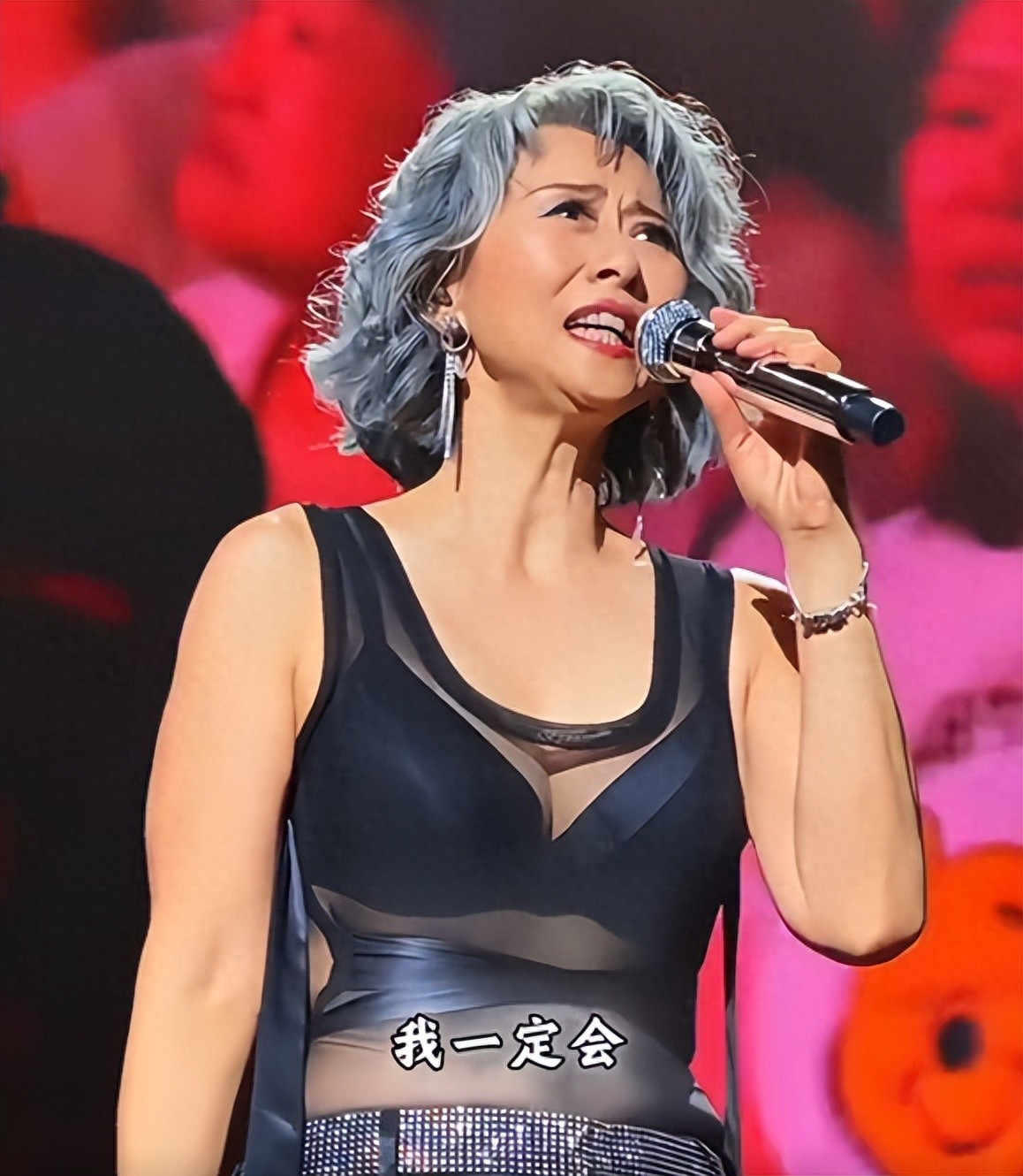 但最让观众尖叫的造型,是她一套黑色透视装。刚开始叶倩文穿着粉色亮片长外套,还挺端庄的。