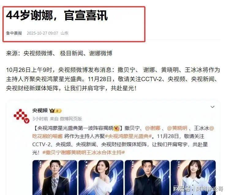 央视频再次发消息官宣,谢娜成为鸿蒙星光盛典主持人。