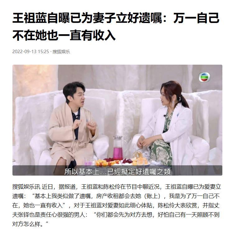 而今年10月初,王祖蓝上综艺《天生一对》时,再次谈到自己担心会比妻子先走。