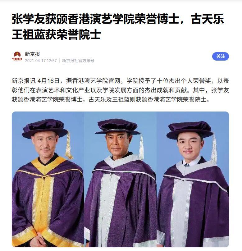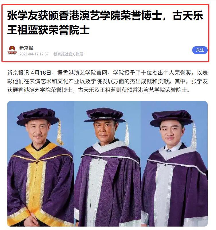 除此之外,2021年4月,王祖蓝还成为了香港演艺学院荣誉院士。