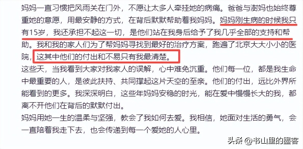 直到1月13日,许何在个人账号发布了长文,字里行间都是对母亲何晴的怀念。