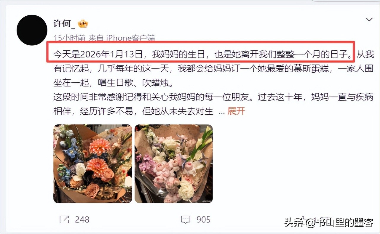 直到1月13日,许何在晚上发文悼念母亲,称当天是母亲的生日。