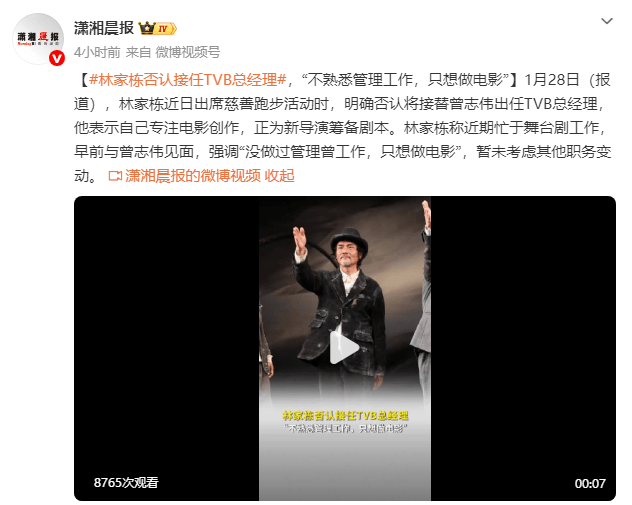 近日,林家栋出席慈善活动时明确否认了外界关于他将接替曾志伟出任TVB总经理的传闻。他在现场表示:“没做过管理曾工作,只想做电影”,强调自己专注电影创作,目前正为新导演筹备剧本,且忙于舞台剧工作,暂未考虑职务变动。