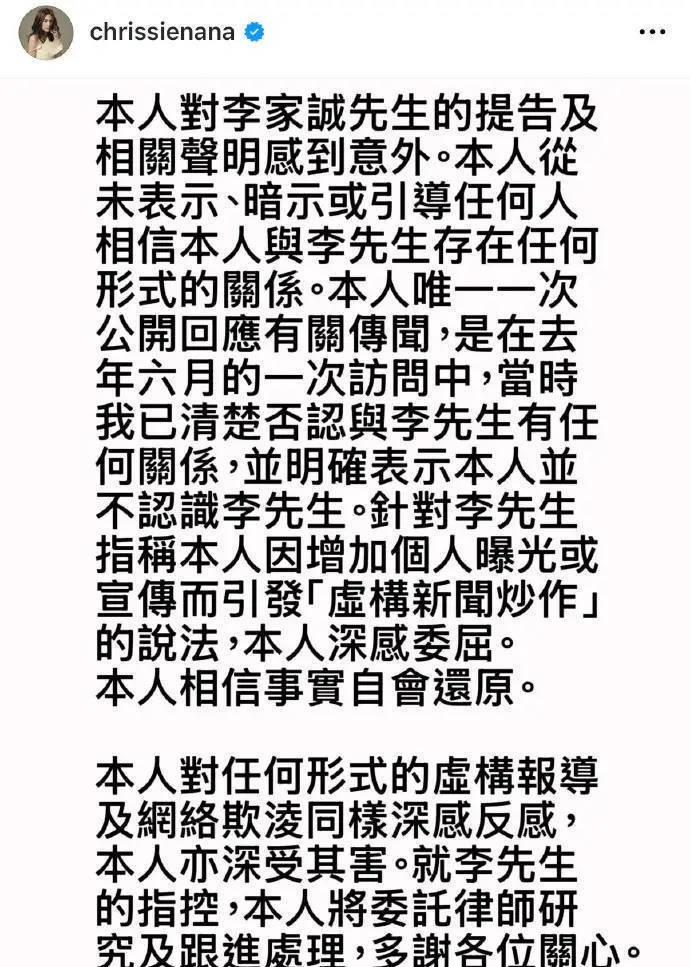 她在声明中强调:“本人从未表示、暗示或引导任何人相信本人与李先生存在任何关系。”针对李家诚方面指其通过虚构新闻炒作以增加个人曝光,周秀娜表示“深感委屈”,并已清楚否认相关指控。目前事件仍在进一步发酵中。