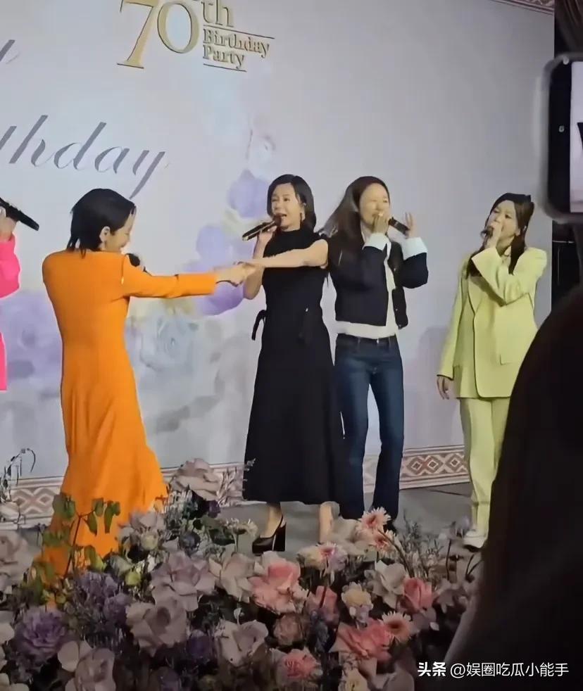 作为徐若瑄的闺蜜,林心如和贾静雯也来给徐妈妈祝寿。徐若瑄身穿一袭橙色修身长裙,和好友们一起在台上唱歌,如痴如醉。