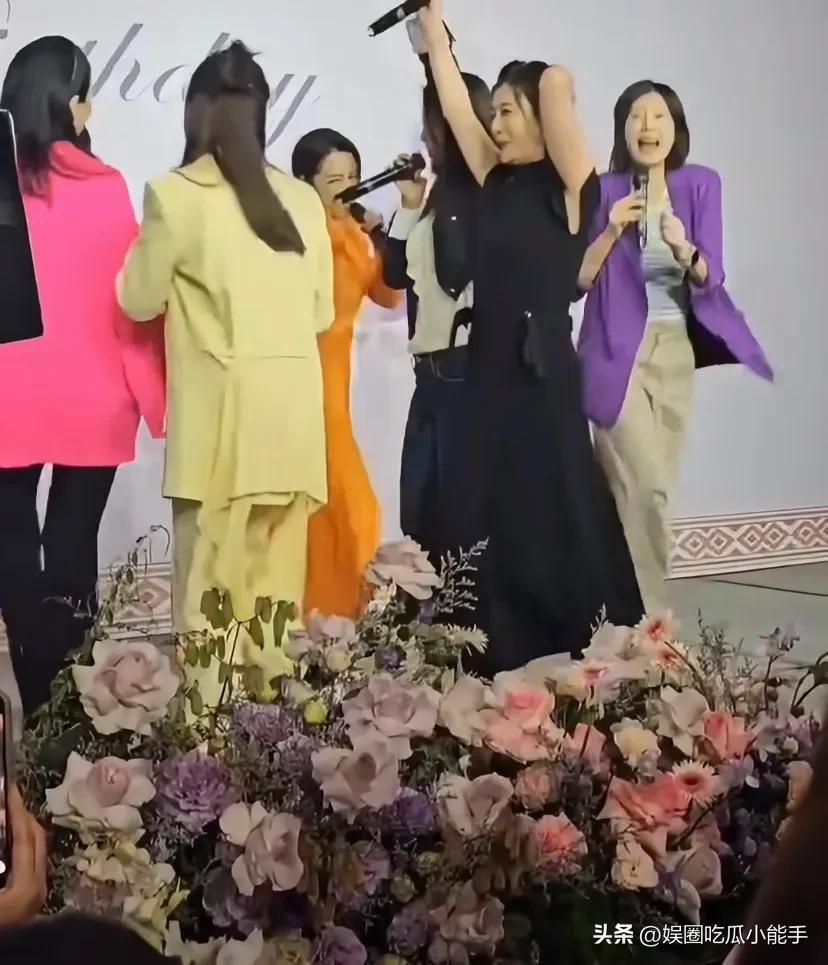 徐若瑄唱歌的时候,贾静雯和林心如搂着对方,摇晃着身体给她加油。贾静雯身穿一袭黑色长裙,脚踩厚底高跟鞋,个头比林心如要矮上不少,穿厚底高跟鞋还没有林心如高。