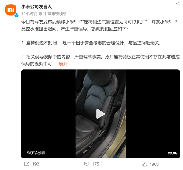 快科技5月17日消息,日前,有网友发布视频称,小米SU7“座椅侧边气囊位置为何可以扒开”,并质疑小米汽车的品控工艺,引起网友热议。